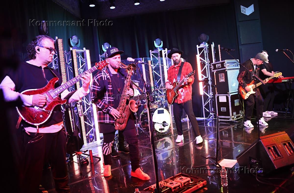 Self-isolation regime caused by the danger of the coronavirus COVID-19 spread. #WeAReTogether event. Filming of an online charity concert by Uma2rman band in the studio. Frontman of the band Vladimir Kristovsky (third from right) performs during the concert.