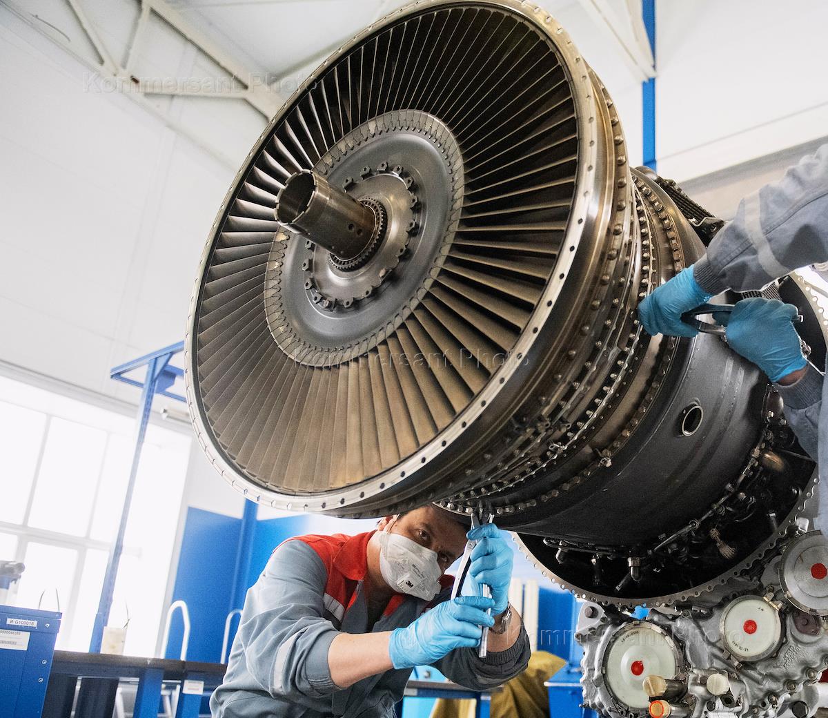 Предприятие Государственного оборонного заказа по ремонту авиационных двигателей военного и гражданского назначения АО "218 авиационный ремонтный завод" (входит в состав АО "Объединенная двигателестроительная корпорация" Госкорпорации "Ростех") во время режима самоизоляции из-за угрозы распространения коронавирусной инфекции COVID-19. Сотрудники предприятия в медицинских масках во время работы.
