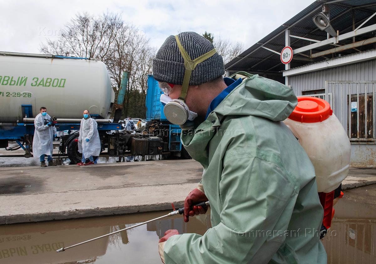 Ленинградская область во время режима самоизоляции из-за опасности распространения коронавирусной инфекции COVID-19. Жанровая фотография. Работа Гатчинского комбикормового завода в условиях эпидемической обстановки. Меры предосторожности и профилактики от коронавируса на производстве. Сотрудник службы дезинфекции автотранспорта проводит обработку транспортного средства перед въездом на территорию завода.