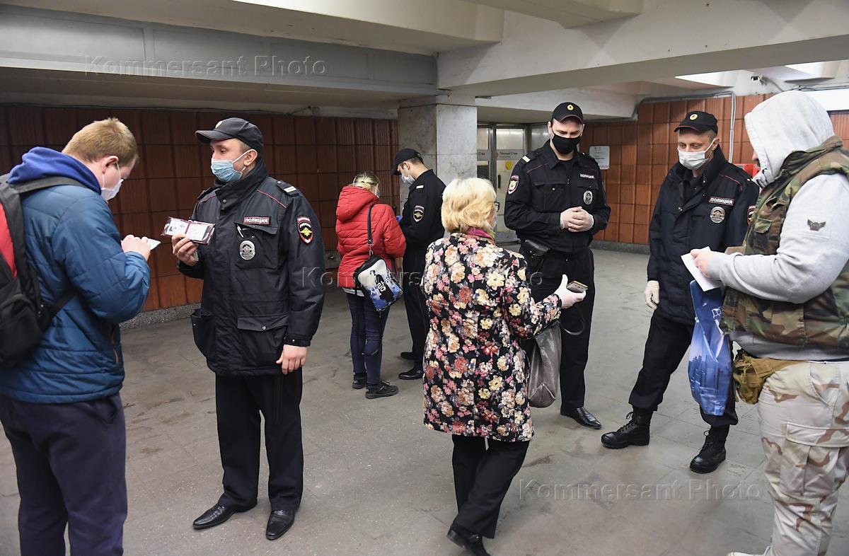 Москва во время режима самоизоляции из-за опасности распространения коронавирусной инфекции COVID-19. Введение пропускного режима. Жанровая фотография. Сотрудники полиции во время проверки пропусков на передвижение по городу у пассажиров при входе на станцию Московского метрополитена.