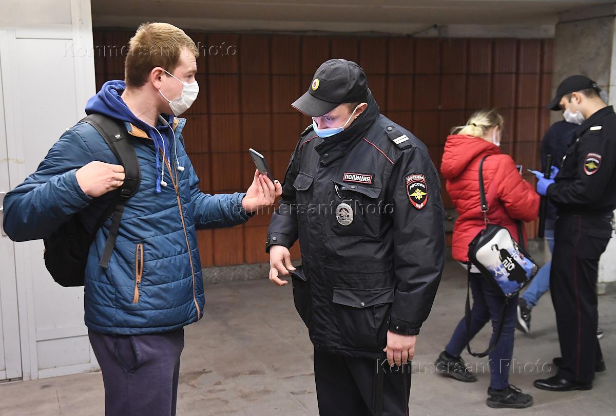 Москва во время режима самоизоляции из-за опасности распространения коронавирусной инфекции COVID-19. Введение пропускного режима. Жанровая фотография. Сотрудники полиции во время проверки пропусков на передвижение по городу у пассажиров при входе на станцию Московского метрополитена.