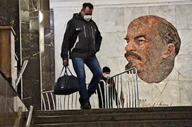 Москва во время режима самоизоляции из-за опасности распространения коронавирусной инфекции COVID-19. Жанровая фотография. Пассажиры в медицинских масках на станции "Библиотека имени Ленина" Московского метрополитена.