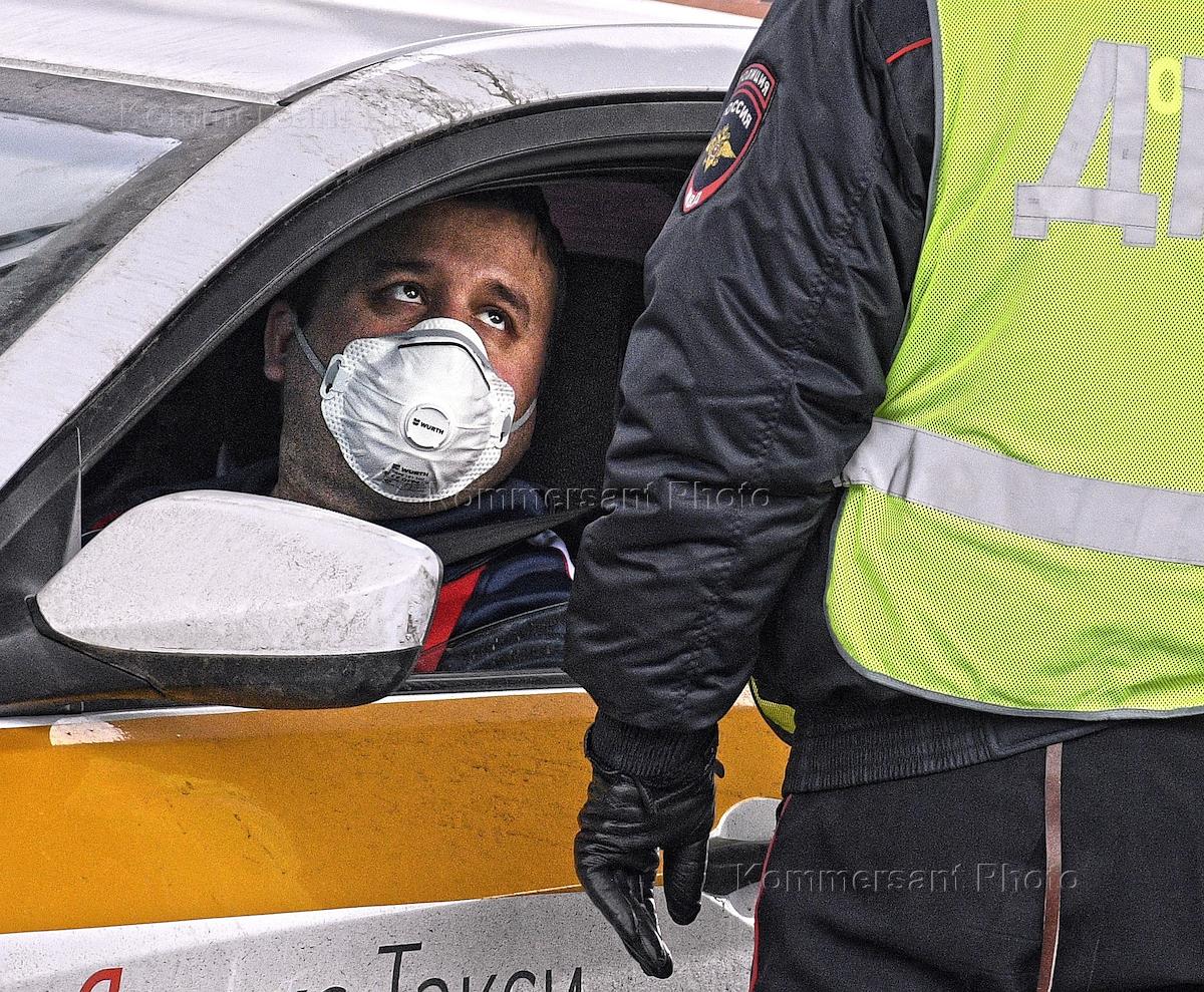 Москва во время режима самоизоляции из-за опасности распространения коронавирусной инфекции COVID-19. Введение пропускного режима. Жанровая фотография. Пост ГИБДД при въезде в Москву на Варшавском шоссе. Сотрудники дорожно-патрульной службы (ДПС) во время проверки у водителей пропусков для въезда в Москву.