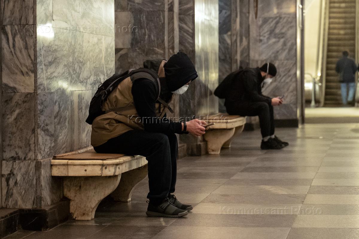 Москва во время режима самоизоляции из-за опасности распространения коронавирусной инфекции COVID-19. Жанровая фотография. Пассажиры в медицинских масках в Московском метрополитене.