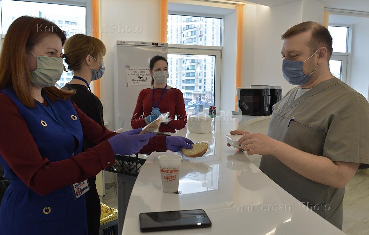 Москва во время режима самоизоляции из-за опасности распространения коронавирусной инфекции COVID-19. Жанровая фотография. Работа волонтеров по организации питания сотрудников в инфекционном центре на базе Федерального центра мозга и нейротехнологий (ФЦМН).