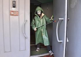 Москва во время режима самоизоляции из-за опасности распространения коронавирусной инфекции COVID-19. Жанровая фотография. Средства индивидуальной защиты (СИЗ) на мужчине, выходящем из подъезда.