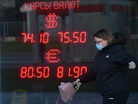 Москва во время режима самоизоляции из-за угрозы распространения коронавирусной инфекции COVID-19. Жанровая фотография. Женщина в медицинской маске проходит мимо информационного табло пункта обмена валюты с курсами доллара и евро.