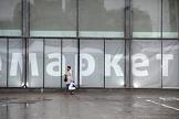 Москва во время режима самоизоляции из-за опасности распространения коронавирусной инфекции COVID-19. Жанровая фотография. Женщина в медицинской маске у витрины супермаркета.