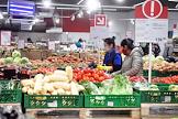 Москва во время режима самоизоляции из-за опасности распространения коронавирусной инфекции COVID-19. Жанровая фотография. Покупатели в медицинских масках в отделе с овощами супермаркета.