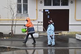 Москва во время режима самоизоляции из-за опасности распространения коронавирусной инфекции COVID-19. Жанровая фотография. Сотрудники коммунальных службы в медицинских масках во время уборки улиц.
