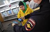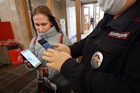 Москва во время режима самоизоляции из-за опасности распространения коронавирусной инфекции COVID-19. Введение пропускного режима. Жанровая фотография. Сотрудники полиции во время проверки электронных пропусков на передвижение по городу у пассажиров при входе на станцию Московского метрополитена.