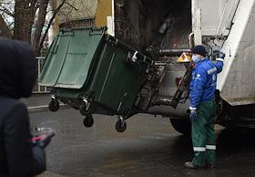 Москва во время режима самоизоляции из-за опасности распространения коронавирусной инфекции COVID-19. Жанровая фотография. . Сотрудник коммунальных служб в медицинской маске во время погрузки мусорных контейнеров в мусоровоз.
