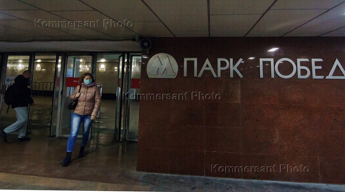 Москва во время режима самоизоляции из-за опасности распространения коронавирусной инфекции COVID-19. Жанровая фотография. Женщина в медицинской маске выходит из вестибюля станции "Парк Победы" Московского метрополитена.