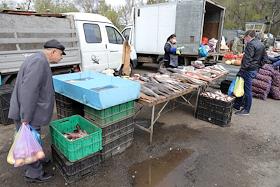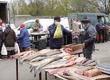 Волгоград во время режима самоизоляции из-за опасности распространения коронавирусной инфекции COVID-19. Жанровая фотография. Покупатели у лотка со свежей рыбой на рынке "Восток" Краснооктябрьского района.