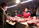 Волгоград во время режима самоизоляции из-за опасности распространения коронавирусной инфекции COVID-19. Жанровая фотография. Продавщица мяса за прилавком на рынке "Восток" Краснооктябрьского района.