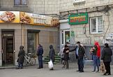 Волгоград во время режима самоизоляции из-за опасности распространения коронавирусной инфекции COVID-19. Жанровая фотография. Покупатели на безопасной дистанции у павильона "Свежая выпечка".