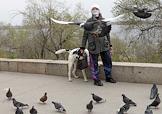 Волгоград во время режима самоизоляции из-за опасности распространения коронавирусной инфекции COVID-19. Жанровая фотография. Пожилая женщина закрыв лицо воротником водолазки в качестве медицинской маски, выгуливает свою собаку на набережной.