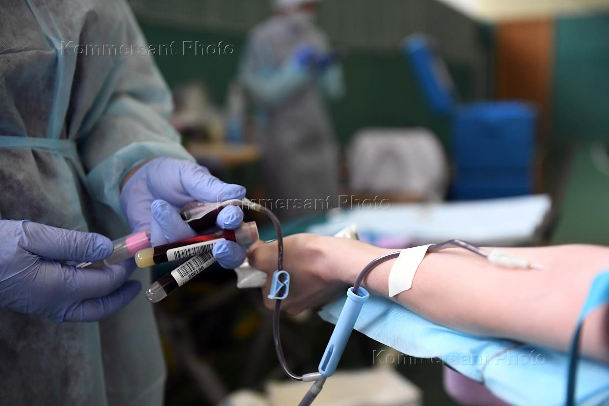 Выездная донорская акция "Добро у нас в крови" прошла в спортивном корпусе Российского национального исследовательского медицинского университета (РНИМУ) им. Н.И. Пирогова. жанровая фотография. Пробирки в руках медицинского работника.