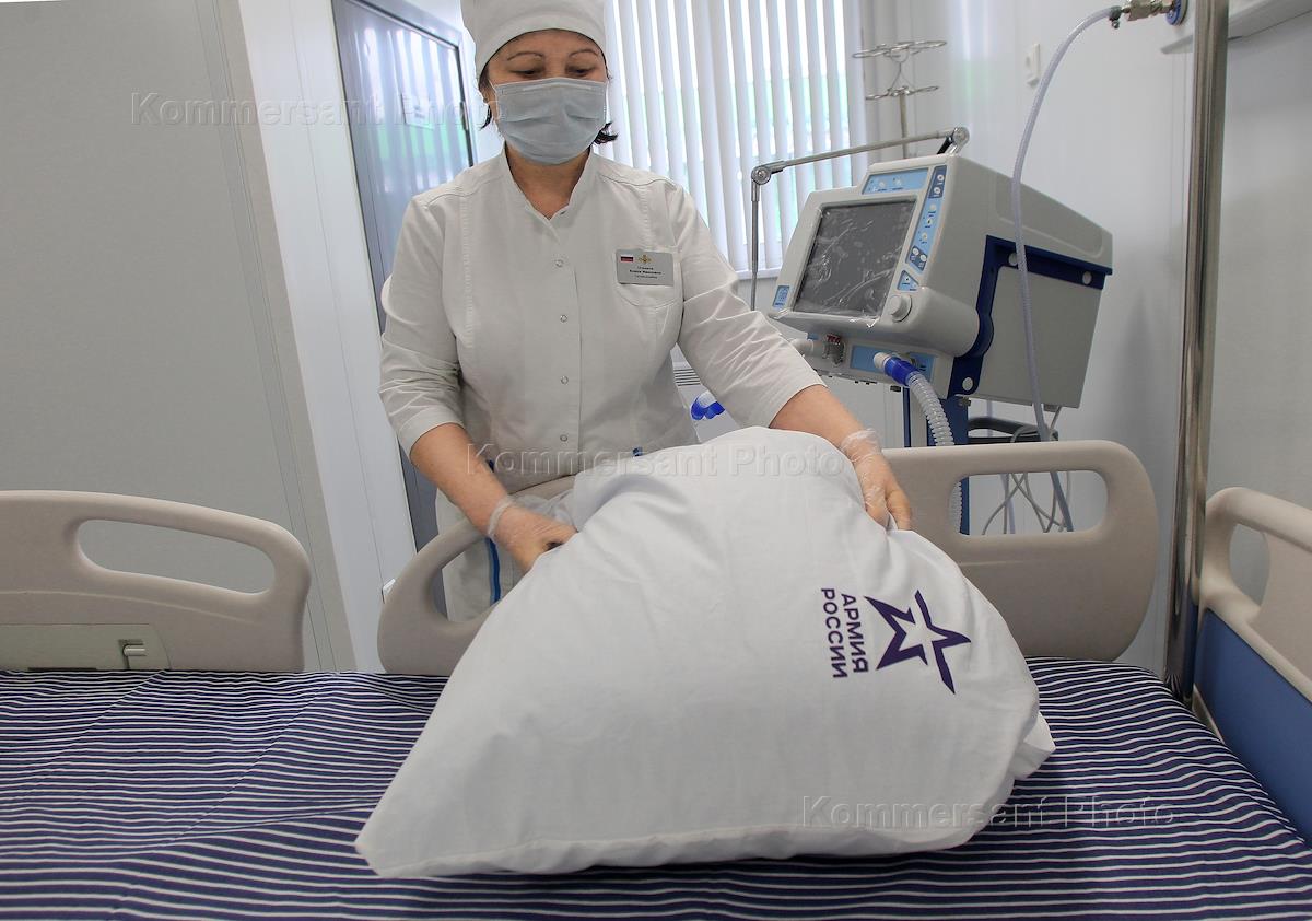 Многофункциональный медицинский центр, открытый на базе госпиталя №422 Министерства обороны России. Медсестры готовят кровать и аппарат ИВЛ для поступающих больных коронавирусом.