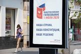 Жанровая фотография. Мужчина в медицинской маске проходит мимо агитационного щита Центральной избирательной комиссии (ЦИК) России по по вопросу одобрения поправок в Конституцию Росси.