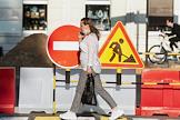 Жанровая фотография. Знаки "Въезд запрещен" (кирпич) и "Дорожные работы" на месте проведения ремонтных работ. Девушка в медицинской маске разговаривает по телефону.
