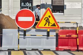 Жанровая фотография. Знаки "Въезд запрещен" (кирпич) и "Дорожные работы" на месте проведения ремонтных работ. Сотрудники полиции в медицинских масках.