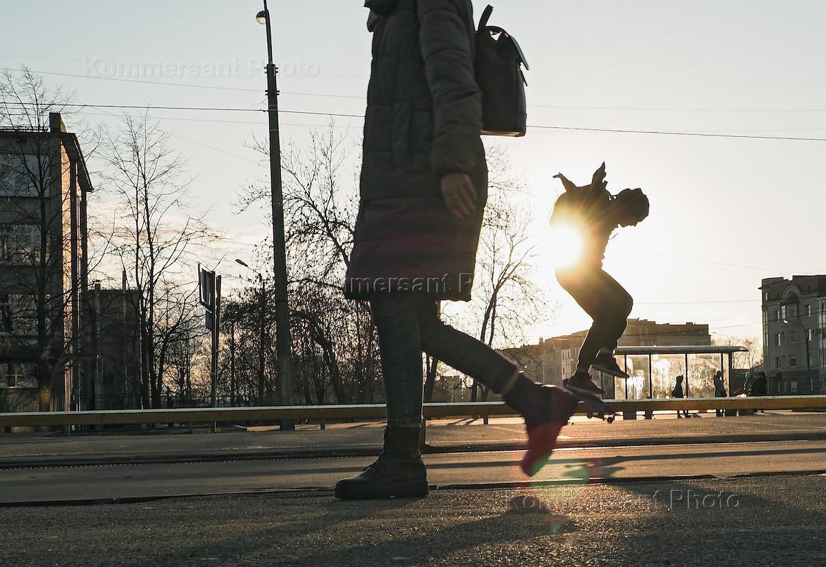 Колпино во время режима самоизоляции из-за угрозы распространения коронавирусной инфекции COVID-19. Молодой человек катается на скейтборде по улице.