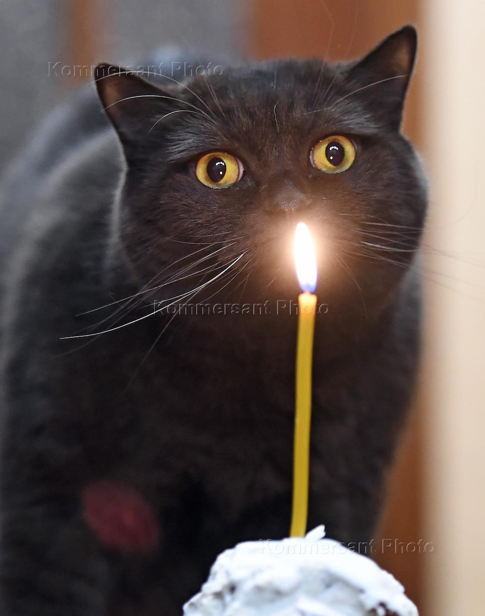 Москва во время режима самоизоляции из-за опасности распространения коронавирусной инфекции COVID-19. Великая Суббота. Чин освящения пасхальных куличей, яиц и пасхи в канун Светлого Христова Воскресения. Жанровая фотография. Черный кот рядом с горящей свечой в пасхальном куличе.