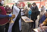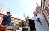 Волгоград во время режима самоизоляции из-за опасности распространения коронавирусной инфекции COVID-19. Великая Суббота. Настоятель Казанского кафедрального собора протоиерей Вячеслав Жебелев (слева) во время чина освящения пасхальных куличей, яиц и пасхи в канун Светлого Христова Воскресения.