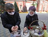 Волгоград во время режима самоизоляции из-за опасности распространения коронавирусной инфекции COVID-19. Великая Суббота. Чин освящения пасхальных куличей, яиц и пасхи в канун Светлого Христова Воскресения в Казанском кафедральном соборе.