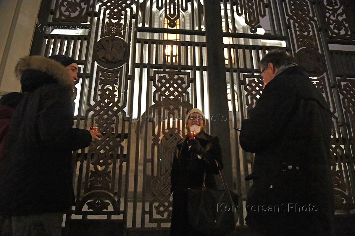 Празднование православной Пасхи в Москве во время эпидемии коронавирусной инфекции COVID-19. Пасхальное богослужение в Сретенском монастыре. Верующие у ворот монастыря.