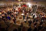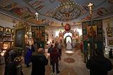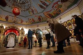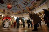 Празднование православной Пасхи во Всеволжске во время эпидемии коронавирусной инфекции COVID-19. Пасхальная служба в храме Спаса Нерукотворного Образа на Дороге жизни. Верующие в медицинских масках в храме во время службы.