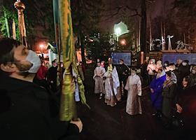 Празднование православной Пасхи во Всеволжске во время эпидемии коронавирусной инфекции COVID-19. Пасхальная служба в храме Спаса Нерукотворного Образа на Дороге жизни. Крестный ход.