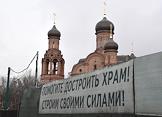 Москва во время режима самоизоляции из-за опасности распространения коронавирусной инфекции COVID-19. Жанровая фотография. Пасха. Светлое Христово Воскресение. Храм Святой Великомученицы Анастасии Узорешительницы в Теплом Стане. Растяжка на ограде храма "Помогите достроить храм! Строим своими силами!".