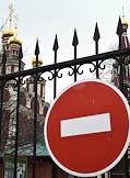 Москва во время режима самоизоляции из-за опасности распространения коронавирусной инфекции COVID-19. Жанровая фотография. Пасха. Светлое Христово Воскресение. Дорожный знак "въезд запрещен" на воротах перед храмом.