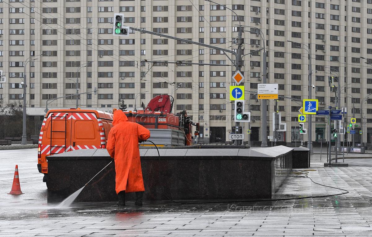 Москва во время режима самоизоляции из-за опасности распространения коронавирусной инфекции COVID-19. Жанровая фотография. Сотрудник коммунальных служб во время весенней промывки и дезинфекции улицы. Калужская площадь.