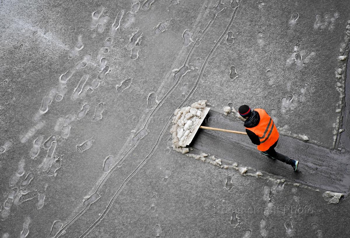 Москва во время режима самоизоляции из-за опасности распространения коронавирусной инфекции COVID-19. Жанровая фотография. Снегопад в Москве. Дворник во время уборки снега во дворе жилого дома.