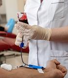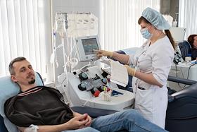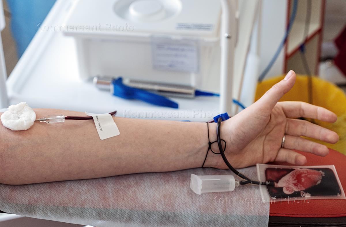 Меры предосторожности из-за опасности распространения коронавирусной инфекции COVID-19. Жанровая фотография. Донор во время сдачи крови в Новосибирском клиническом центре крови (ГБУЗ НСО НКЦК).
