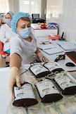 Меры предосторожности из-за опасности распространения коронавирусной инфекции COVID-19. Жанровая фотография. Сотрудники лаборатории Новосибирского клинического центра крови (ГБУЗ НСО НКЦК) в медицинских масках во время приема крови у доноров.