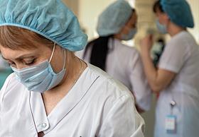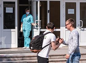 Меры предосторожности из-за опасности распространения коронавирусной инфекции COVID-19. Жанровая фотография. Сотрудница Новосибирского клинического центре крови (ГБУЗ НСО НКЦК) в медицинской маске перед входом в здание.