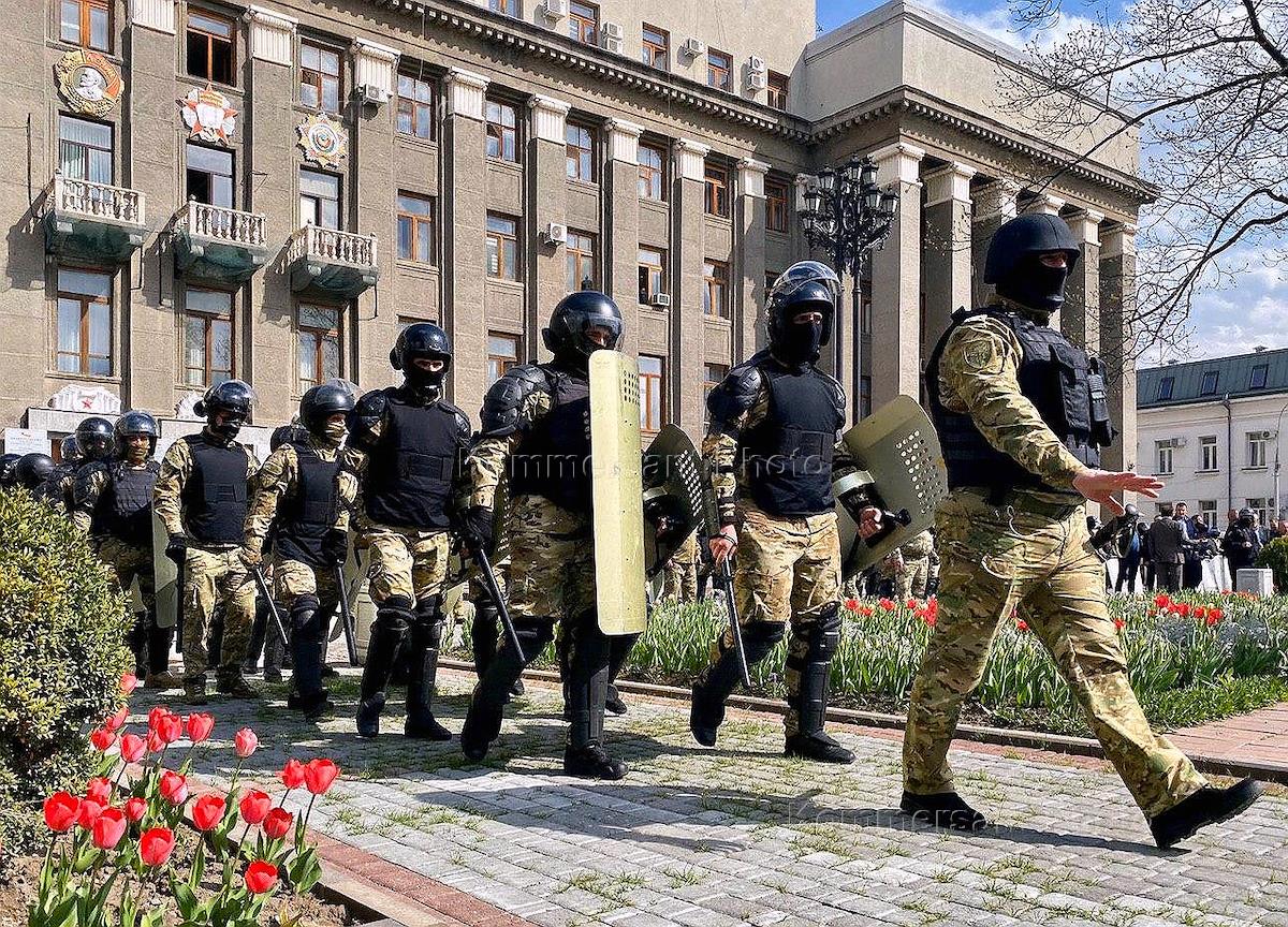Владикавказ во время режима самоизоляции из-за опасности распространения коронавирусной инфекции COVID-19. Сотрудники Росгвардии во время несанкционированного митинга против режима самоизоляции на площади Свободы.