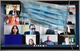 Москва во время режима самоизоляции из-за опасности распространения коронавирусной инфекции COVID-19. Трансляция выступления министра иностранных дел России Сергея Лаврова в рамках заседания "круглого стола" с участниками Фонда поддержки публичной дипломатии имени А.М.Горчакова в формате видеоконференции. Жанровая фотография. Участники видеоконференции на экране телевизора и медицинская маска.