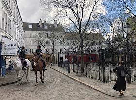 Виды Парижа во время режима самоизоляции из-за опасности распространения коронавирусной инфекции COVID-19. Жанровая фотография. Сотрудники конной полиции во время патрулирования улиц.