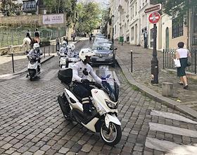 Виды Парижа во время режима самоизоляции из-за опасности распространения коронавирусной инфекции COVID-19. Жанровая фотография. Сотрудники конной полиции и полицейские на мотороллерах во время патрулирования улиц города.