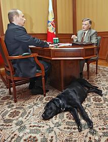 Президент России Владимир Путин (слева) и президент ОАО "Российские железные дороги" (РЖД) Владимир Якунин (справа) во время встречи в президентской резиденции "Бочаров ручей".