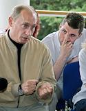 Президент России Владимир Путин (в центре) на встрече с активистами движения "Наши" в президентской резиденции "Бочаров ручей".