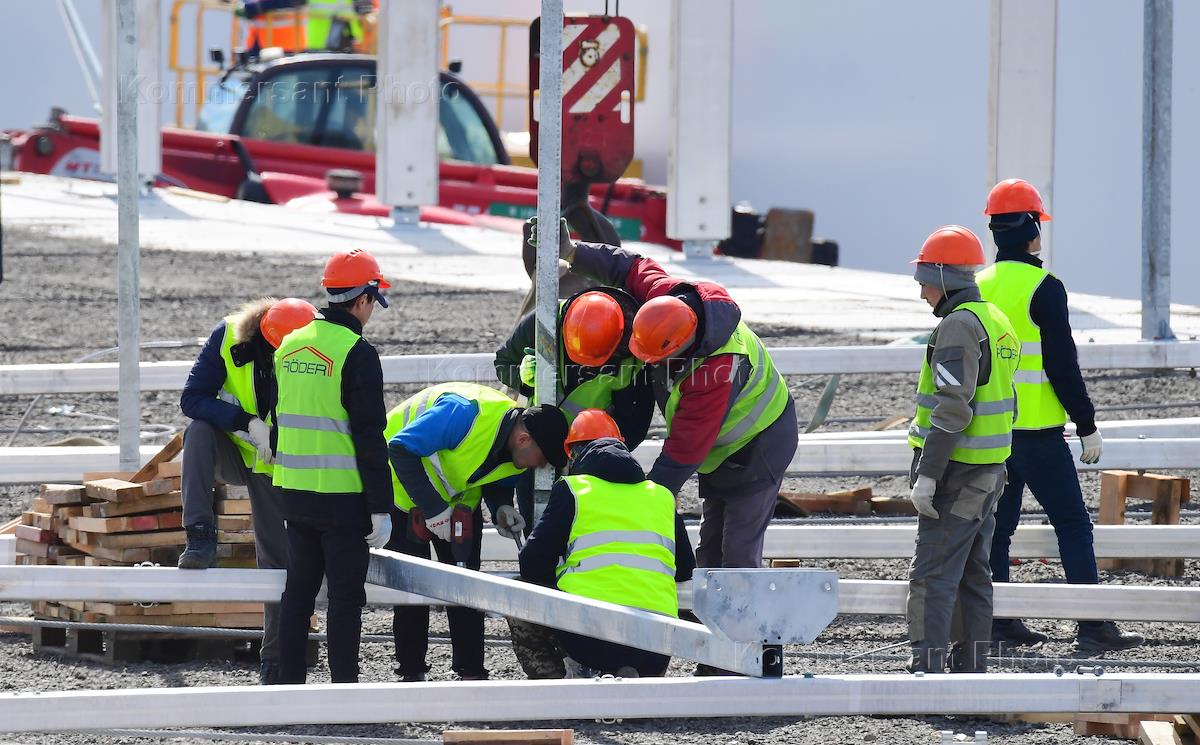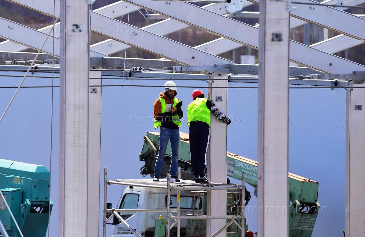 Меры противодействия распространению коронавирусной инфекции COVID-19. Жанровая фотография. Строители во время возведения новых больничных корпусов для пациентов с подтвержденным диагнозом COVID-19, строящиеся в поселке Коммунарка Новой Москвы.