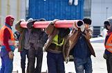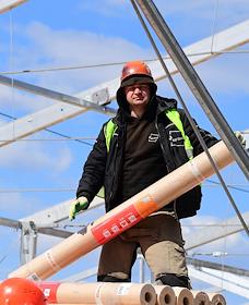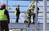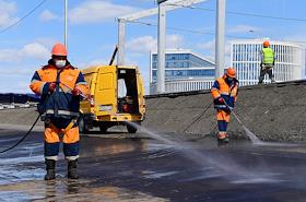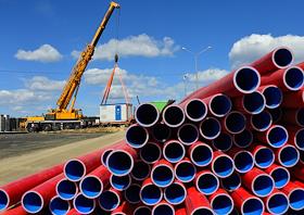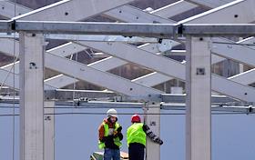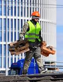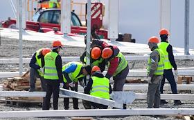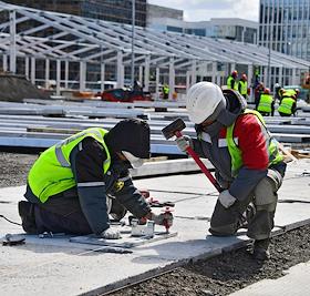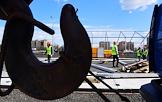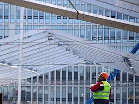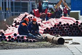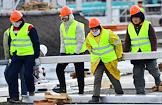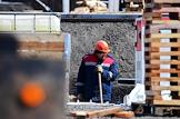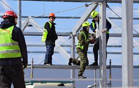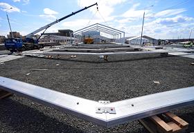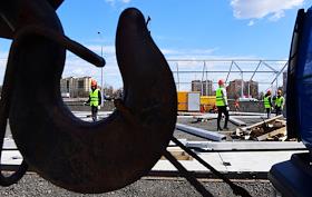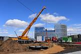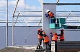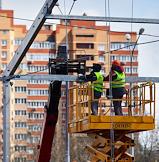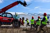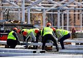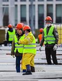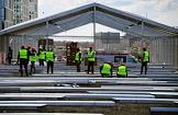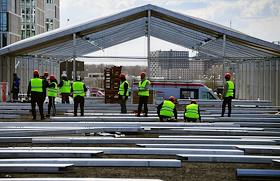Preventive measures against the spread of coronavirus COVID-19. Genre photo. Builders construct new hospital buildings for confirmed COVID-19 patients in Kommunarka village in New Moscow.