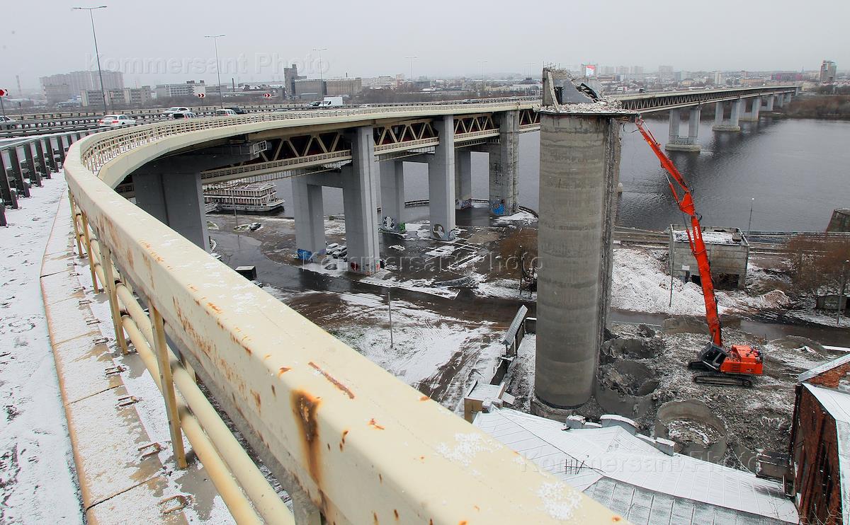 Views of Nizhni Novgorod. Dismantlement of the grain elevator of Baskirov Flour Milling Plant. Metro bridge across Oka River.