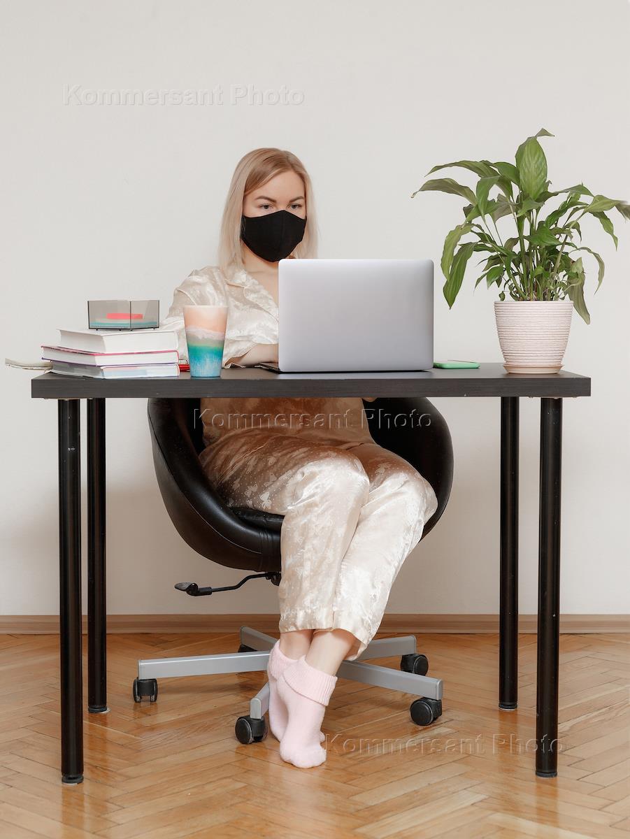 Москва во время режима самоизоляции из-за угрозы распространения коронавирусной инфекции COVID-19. Жанровая фотография. Женщина в медицинской маске т щелковой пижаме за ноутбуками во время дистанционной работы.